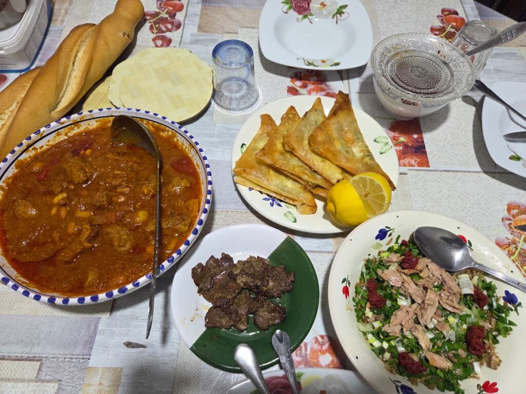 牛肉と豆の煮込み、七面鳥の肝、ブリック(チュニジアの国民スナック、ツナと生卵、ポテトが入った揚げ春巻き)